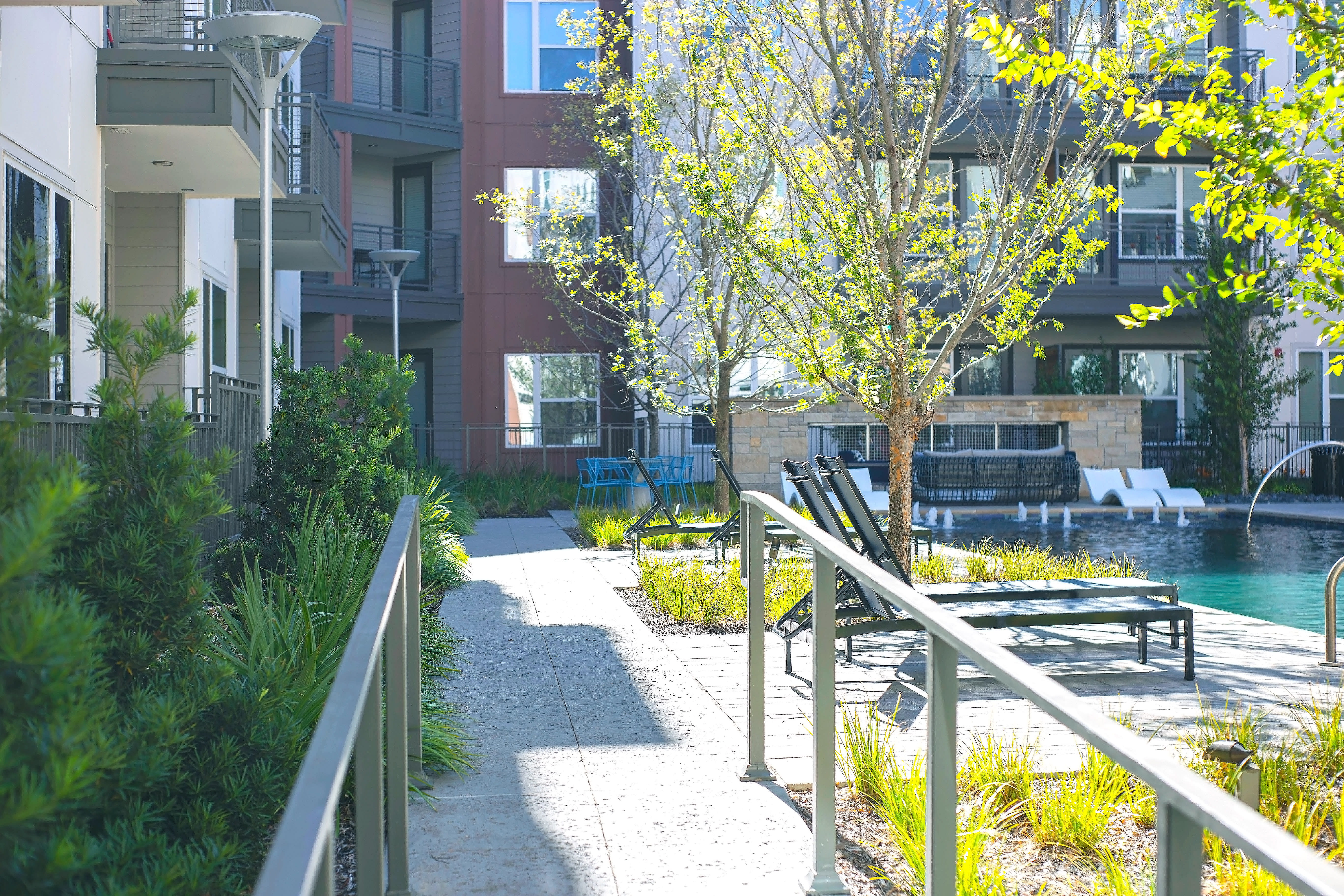 This stunning landscape enhances the property's features. The pottery and planting enliven the space. Residents can enjoy this lush landscape while having a day at the pool.