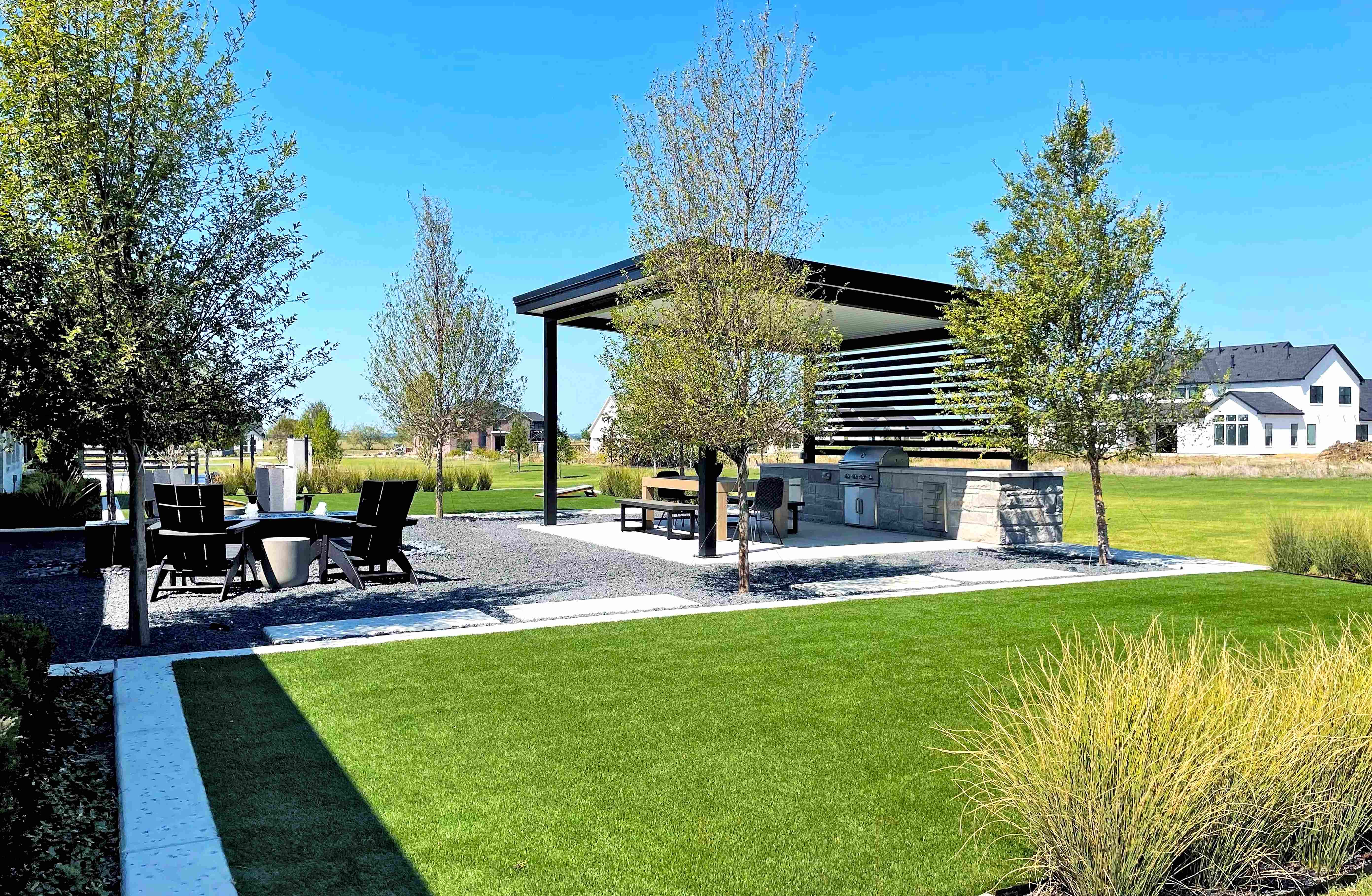 The private sitting area by the entry, with its natural materials and colors, and the spacious outdoor arbor with a tall stone fireplace which is adjacent to a mini golf course, makes this a landscape to rally around day and night.